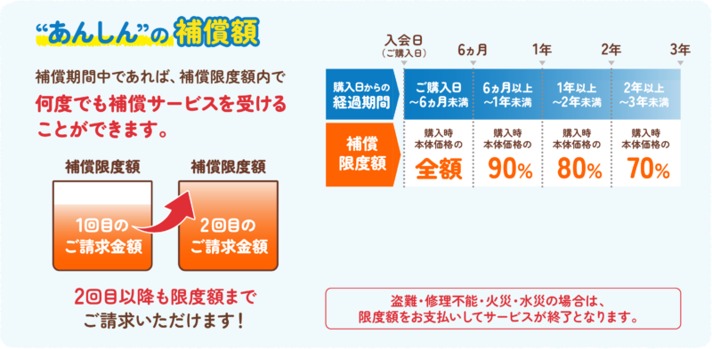 ただし、入会は購入当日しか加入できません。会費は1回修理すれば元が取れるくらいの低価格なので入っておいて損はないと思います。盗難補償も今までの他のサービスに比べてかなり良い内容となっています。ぜひご検討ください。