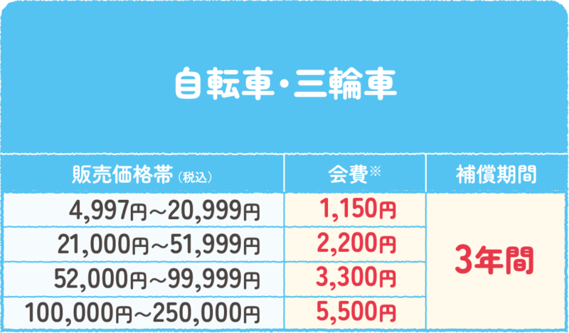 盗難から使用時の故障、火災等の自然災害なども補償の対象になるのでお子さんの通学自転車におすすめな補償サービスです。