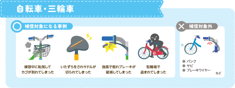 パンクやサビ、消耗品・経年劣化や後付けライトなどの付属品は対象外となりますが、走行中に転倒して破損した場合や風で倒れて壊れた場合の修理代や盗難の補償が受けられます。